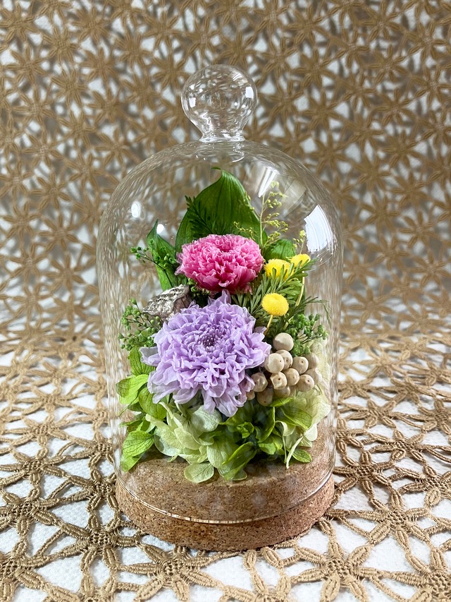 小さなガラスのドームに、ミニマムを可憐に咲かせました。 心静かに想いを巡らせる時間に寄り添う、優しいアレンジメントです。 サイズ:約φ14×H17mm 花材::プリザーブドフラワー / 和菊,シルバーデイジー,紫陽花,かすみ草,アナスタシア,山シダ,ポアプランツ,シャークリーフ,アレカヤシ,ヒカゲカヅラ,ストーべ,その他 花器:ガラス,コルク ◯一点ずつ、心を込めてお作りしています。