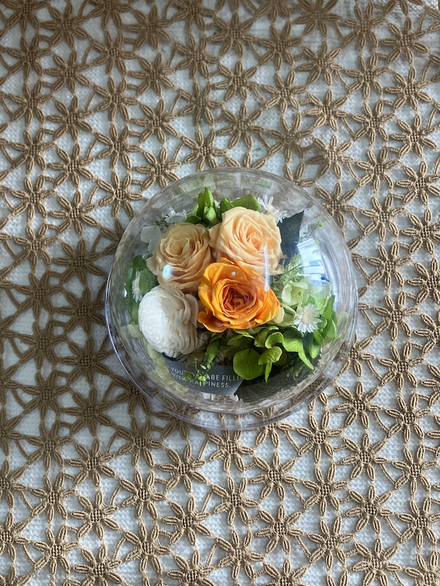 ビビットなオレンジの濃淡で作られた明るく元気な気持ちになるような華やかなアレンジメントです。柔らかな印象の丸いドーム型フレームで、様々なシーンの贈り物にピッタリです。 サイズ:φ13×H13cm 花材:プリザーブドフラワー / ローズ,アジサイ 副資材:リボン 花器:プラスチック