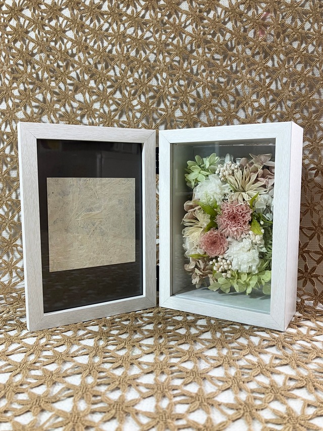 ホワイトフォトフレームで穏やかな印象を持たせたメモリアルアレンジメントです。左には大切なお写真を飾ることができます。 サイズ:フレームオープン◯約W240×D55×H170 mm クローズ◯約W120×D68×H170 mm 花材::プリザーブドフラワー / 小菊,カーネーション,紫陽花,ニゲラオリエンタス,ライスフラワー,ヤマシダ,ラスカル,ジュート,モス 花器:木製フレーム、ガラス ◯一点ずつ、心を込めてお作りしています。
