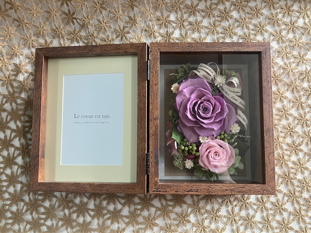 落ち着いた色合いのウッドフレームに大きくハート型に開花させたピンクローズと優しくそっと寄り添うピンクローズのアレンジメント。メッセージや写真を入れて飾っていただけます。 サイズ:W ×D ×H cm 花材:プリザーブドフラワー / ローズ,アジサイ 副資材:リボン 花器:ウッドフレーム,ガラス ◯一点一点、心を込めてお作りしています。
