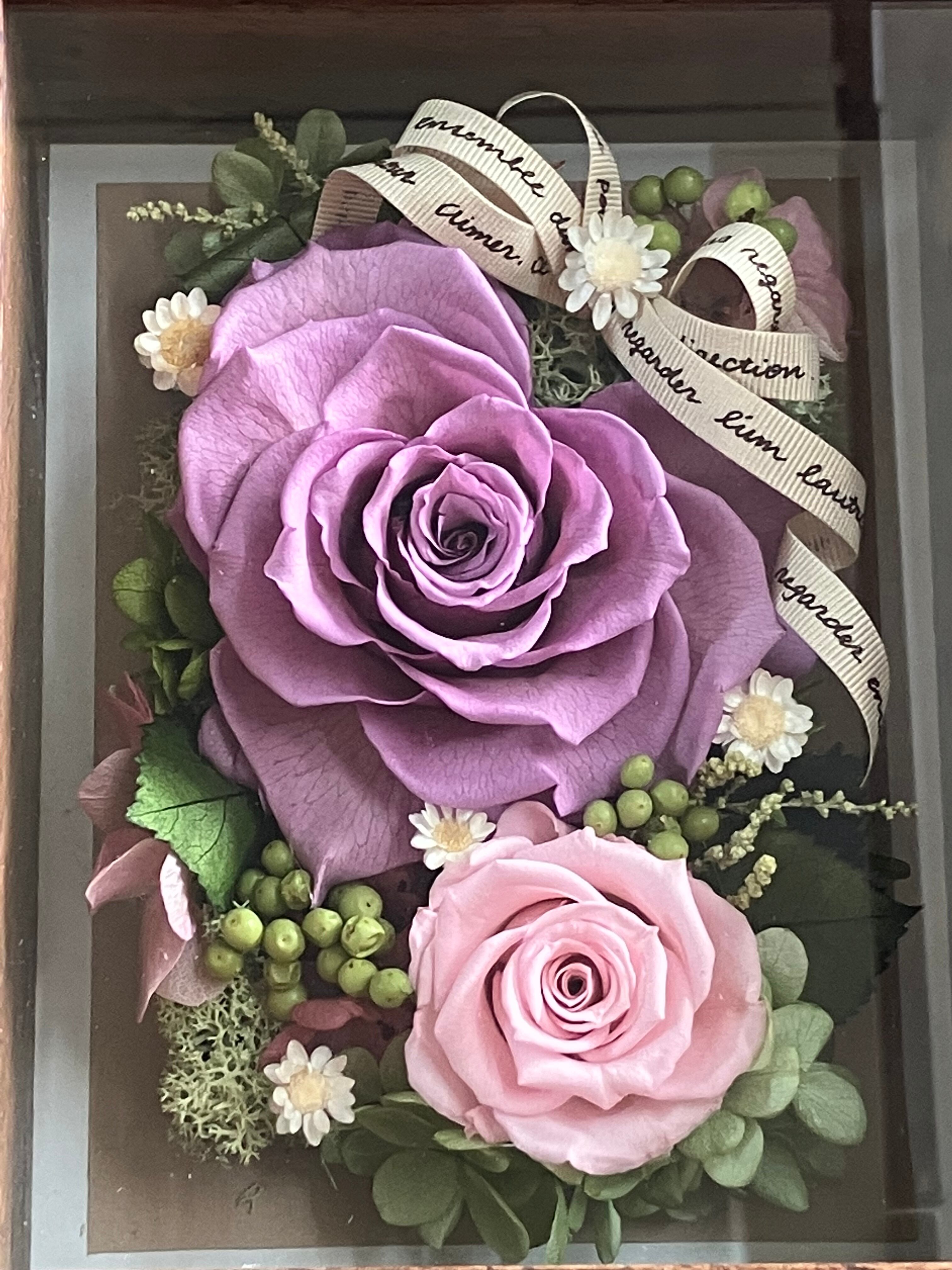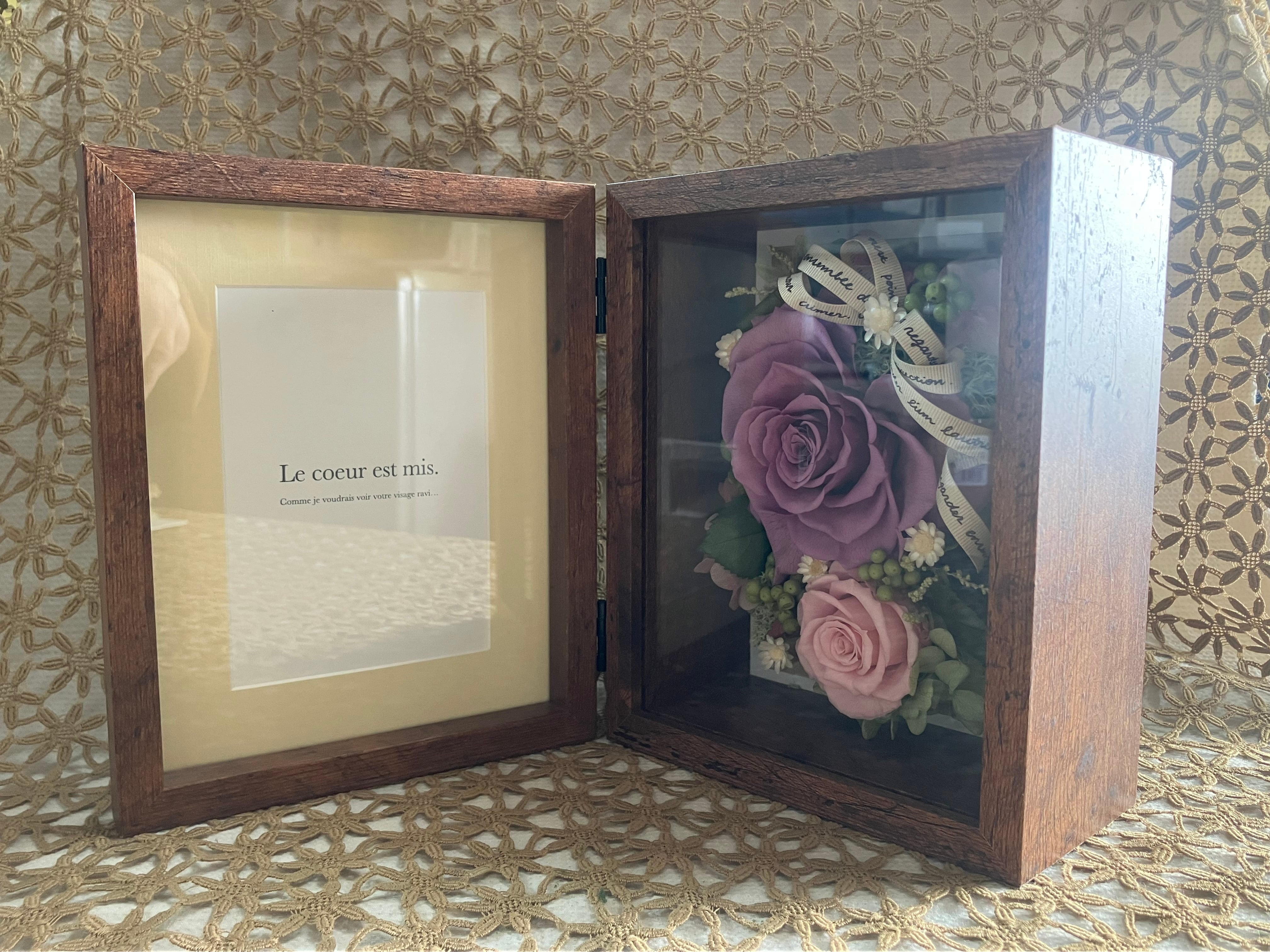 落ち着いた色合いのウッドフレームに大きくハート型に開花させたピンクローズと優しくそっと寄り添うピンクローズのアレンジメント。メッセージや写真を入れて飾っていただけます。